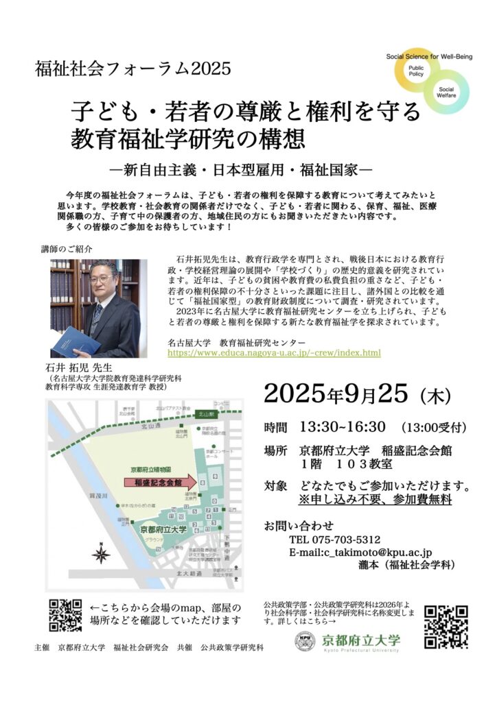 京都府立大学福祉社会研究会と京都府立大学大学院公共政策学研究科では、下記の要領で2025年度の福祉社会フォーラムを開催します。