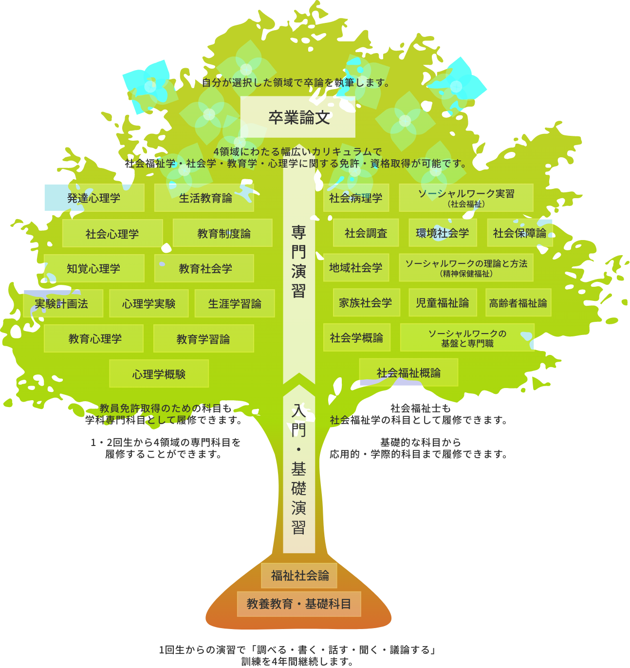 福祉社会学科では社会福祉学、社会学、教育学、心理学の4つの分野をおいています。それぞれの学問のアプローチを活かしながら、各分野が交わり合うことで、福祉社会の実現と、ここにしかない学びの実現を目指しています。